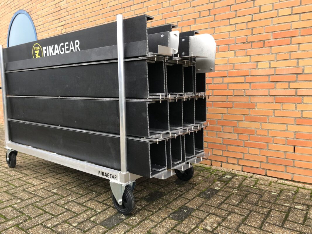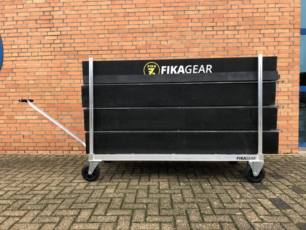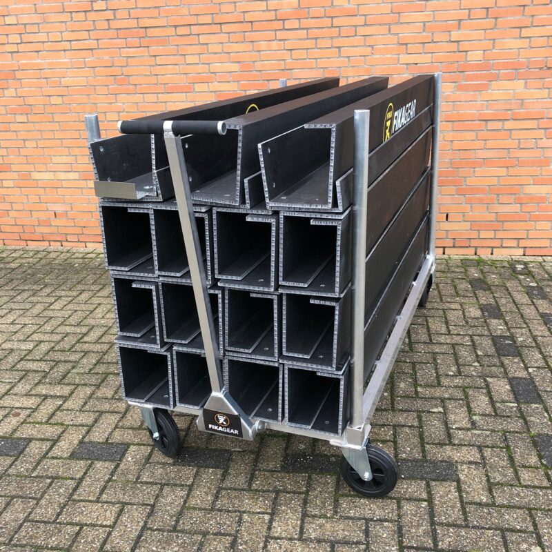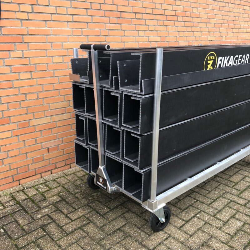 Lichtgewicht transport trolley voor het opbergen en transporteren van de Hockey5S boarding voor type U22 en de G25. De transport trolley is geheel vervaardigd uit aluminum en heeft een draag vermogen van 350kg. De grote wielen maken het mogelijk om de transport trolley over het kunstgras en de bestrating te rijden. Per volledig Hockey5S veld heeft u 2 transport trolleys nodig. Op elke transport trolley komen dan 30 elementen te liggen.
